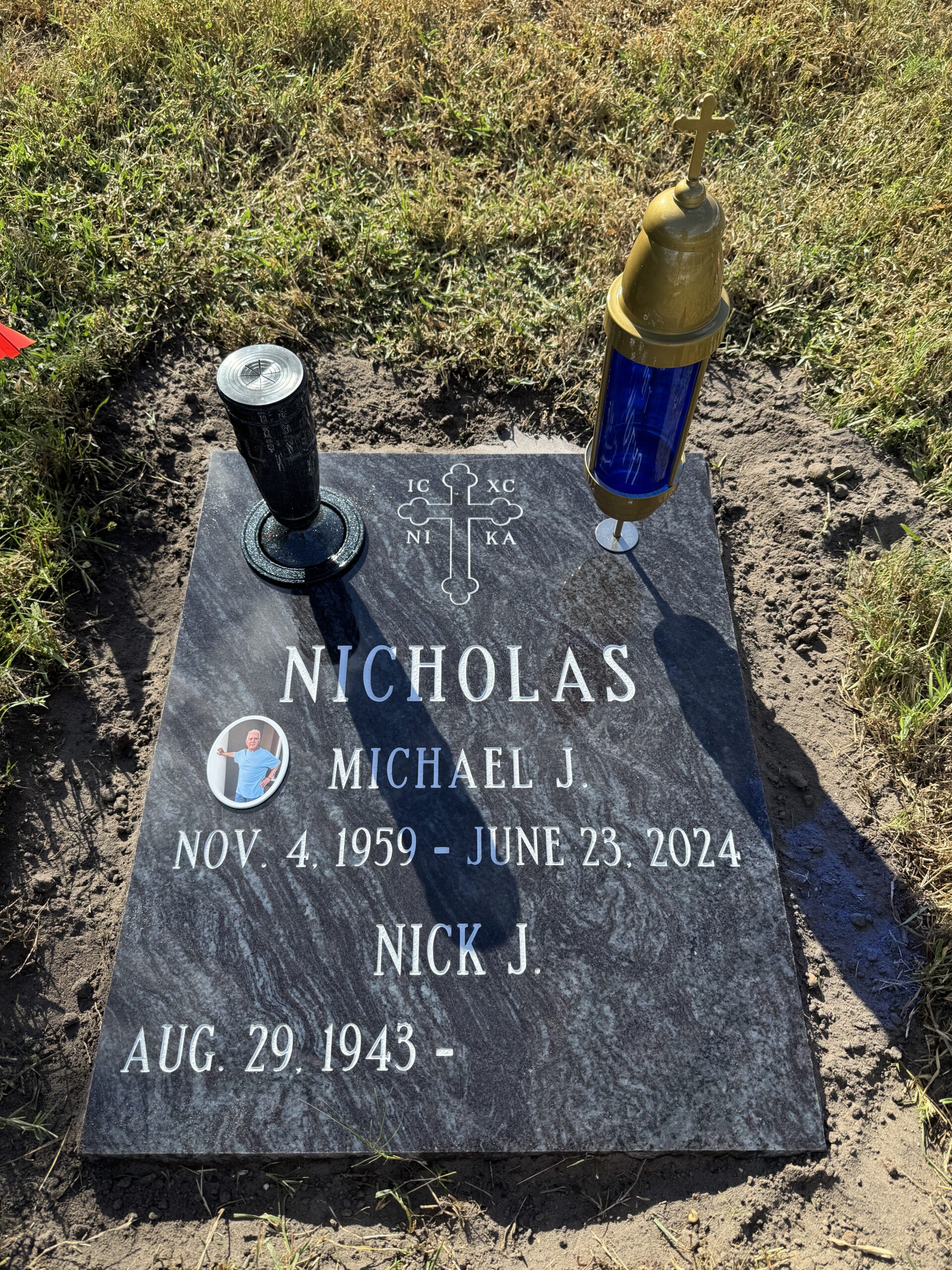 Bahama Blue lawncrypt with vase and blue lens candleholder Greek orthodox Cycadia Cemetery